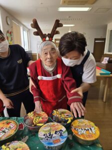 函館塩ラーメンを触ろうとするご利用者の手を何気に違うラーメンに誘導するスタッフ(自分が食べたいんか~い)