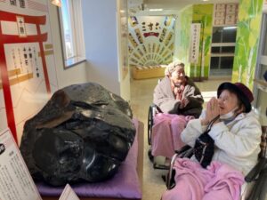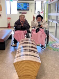 有名なお菓子のベンチ「コレ座ったら後ろにひっくり返るしょ?」と車椅子のご婦人たち。