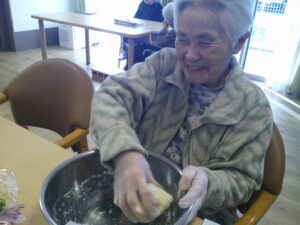 皮をのばし、具を包む工程では、生活歴を活かした自然な動作が随所に見られ、「昔はよく作ったのよ」と当時の暮らしを思い出しながら取り組まれていました。