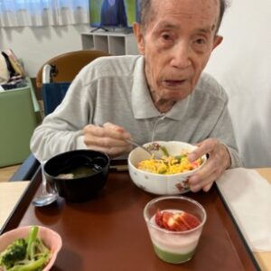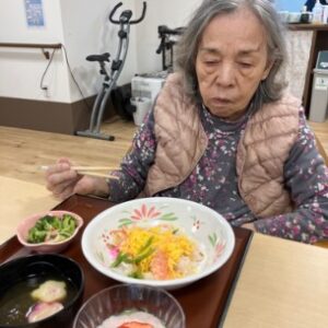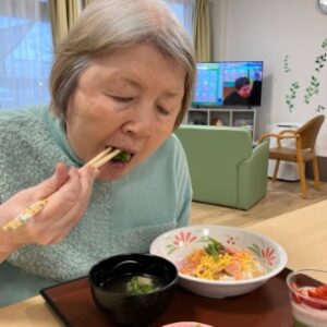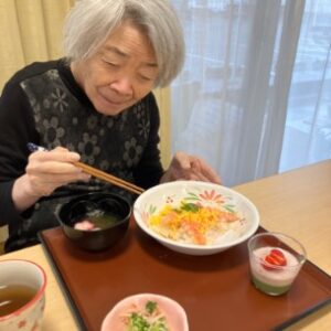 「久しぶりにちらし寿司を食べたよ」「とてもおいしいね」と笑顔でお話しされながら、ゆっくりと召し上がる様子が見られました。