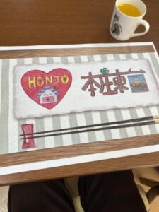 待ちにまったお昼ご飯は、レストラン「えん」さんのお弁当です。数日前に、皆さんには好きなお弁当を選んでいただきました。手作りのランチョンマットの上に、お弁当を乗せて皆様にご提供。