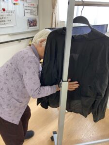 この日は、皆で協力して洗濯物干しを行いました。衣類を広げてシワを伸ばし、ハンガーにかける一連の動作は、手指の細かい動きやバランス感覚を養う素晴らしい機会です。