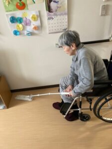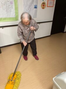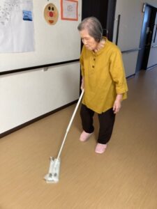 フロアやお部屋内をモップで丁寧に清掃してくださっています。 車椅子の方も、手が届く範囲をしっかりとお掃除。工夫を凝らして活動される姿に頭が下がります。