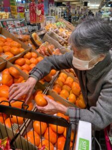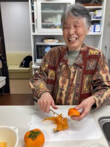 買い物中、美味しそうな柿が売っていました。「Hさん、柿むいてもらえますか?」と聞いたところ「いいわよ~」と笑顔でお返事。おやつに決めました!