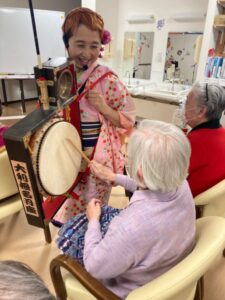 出演者の方が皆さまの近くまで来てくださり、太鼓を叩かせてくれる嬉しいサプライズも!大きな太鼓を叩く入居者さんの笑顔がとても素敵です♪