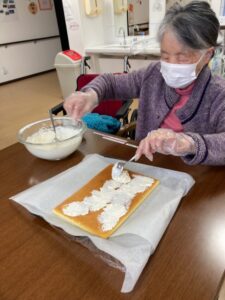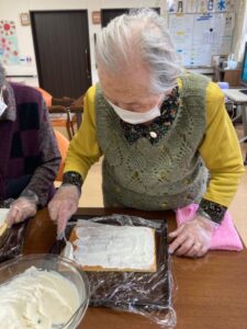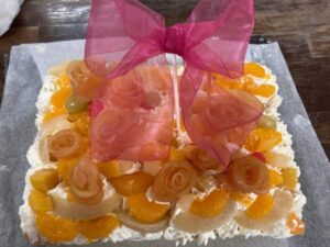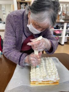 フルーツを切る係、生クリームを塗る係、ケーキの飾りつけをする係、と協力して作業が進みます。皆さんお料理が得意な方ばかりなので、ほとんどおまかせして愛情たっぷりのケーキが出来上がりました🍰