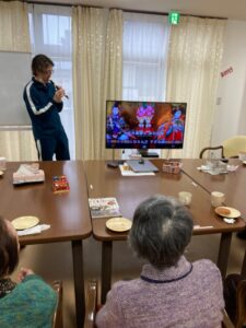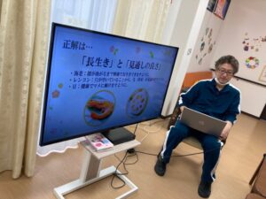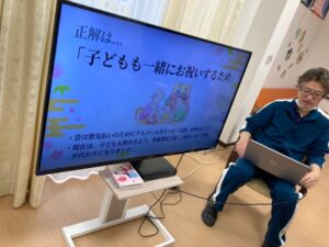 モニターを使って、行事食(海老、レンコン、豆)に込められた意味、ひな祭りはお酒ではなく甘酒を出すのはなぜ?などを、クイズを通じて皆さまで改めて学びました。