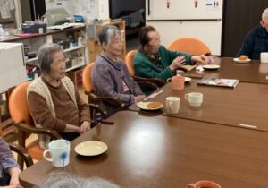 最後は、お楽しみのティータイムです。 可愛らしいお雛様のお菓子と温かいお茶を囲んで、思い出話に花が咲きます。