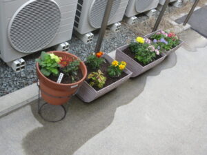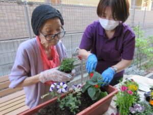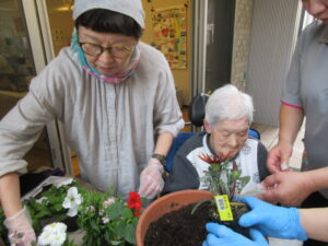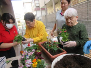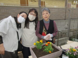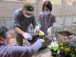 皆一緒にプランターに花を植えました。