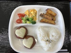 かわいいハート❤️のチーズハンバーグに、ごはんをハート🩷形にもりました。