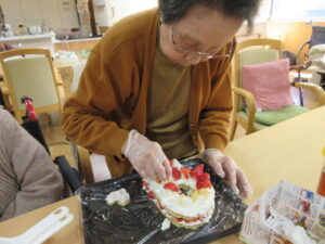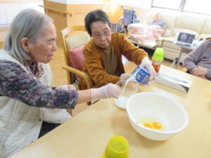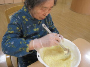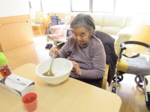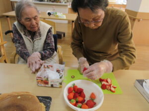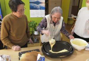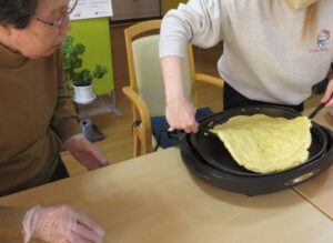 入居者様も「私がするよ」とひっくり返す気満々でしたが大きなパンケーキを目の前に