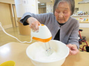 生地が焼けるまで生クリームを泡立てたり、