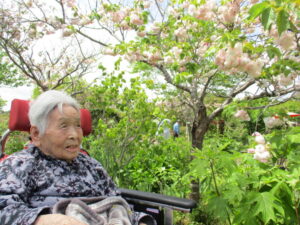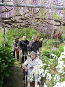 見事な藤棚、色とりどりの花々にご利用者様もうっとり^_^