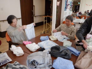 テーブルを囲んで会話をしながら洗濯物をたたんでいます。