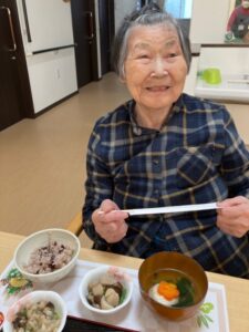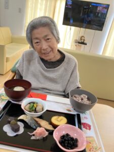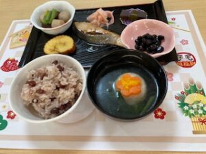 ・伊達巻・お赤飯・お雑煮風すまし汁・羊羹