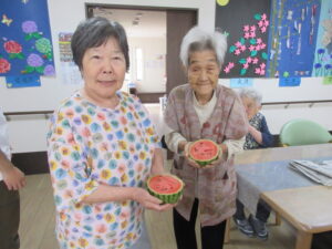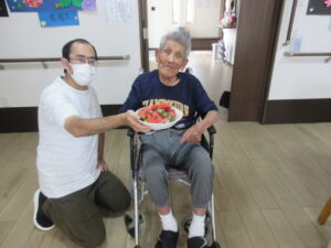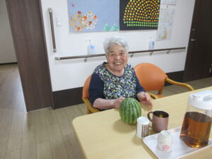 味もすごく甘く、利用者様はスイカの皮?の部分もかみつきながら召し上がっておられました。