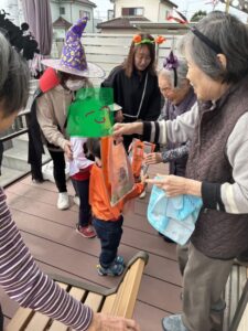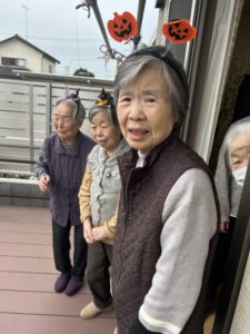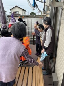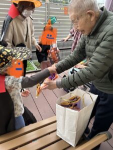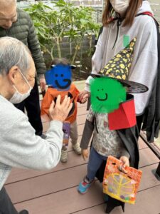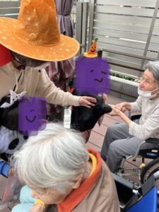 “お菓子をくれないといたずらしちゃうよ”の決めゼリフと共に入居者さんたちは大喜び❣