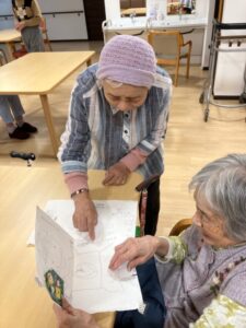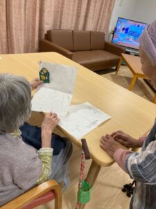 T様は、ひ孫さんの描いたおばあちゃんの似顔絵をM様に見せて談笑されていました