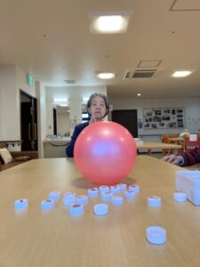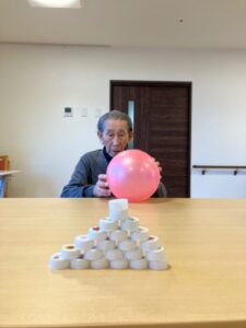 ペットボトルの蓋を積み上げ、ボールで崩すゲームをしていました