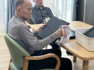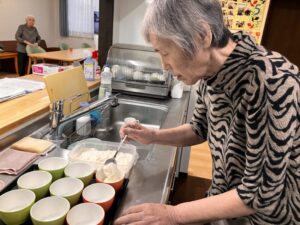 最後は、女性入居者様が 台所でおかずの盛り付け を担当🍱