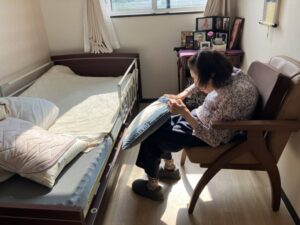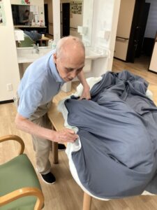 布団カバーや枕カバーの取り付けでは、慣れた手つきで器用に作業を進められ、
