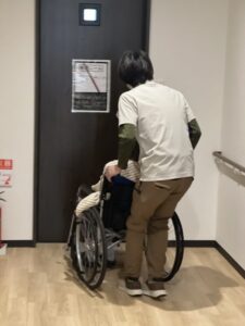 避難訓練の後は、車椅子を使って階段から避難する練習も行い、職員も真剣に取り組んでいました🦺💪