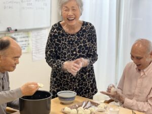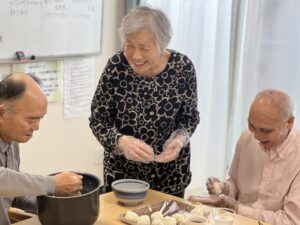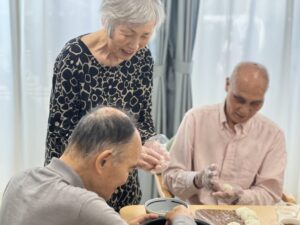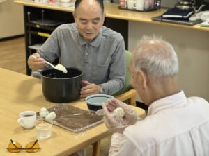 男性入居者様が協力して、手のひらにご飯を乗せる係と、握る係に分かれて頑張ってくださいました👏✨