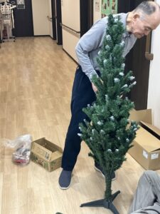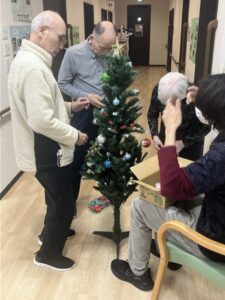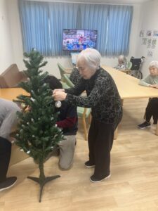 枝を広げたり、オーナメントを選んだりとスタッフも入居者様も力を合わせて準備✨
