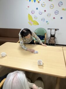 テーブル拭きでは、別の入居者さまが布巾を持ち、食事スペースをピカピカに整えてくださいました🍽️🧼