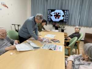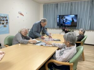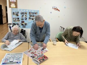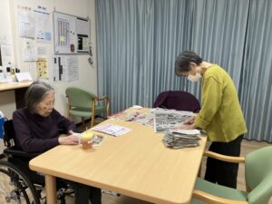 新聞紙を折る作業は、指先をしっかり使う良い機能訓練にもなります。
