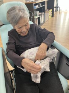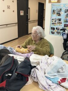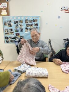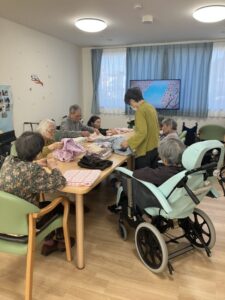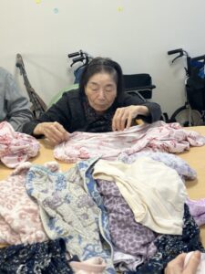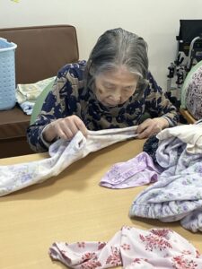 フロアにて、入居者様と一緒に洗濯物たたみを行いました😊