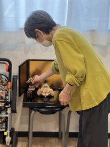 女性入居者様は、お雛様などの人形を一つひとつ丁寧に並べ、ぼんぼりやお花の飾り付けも行ってくださいました🌸