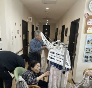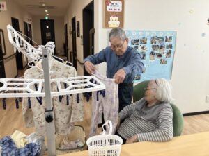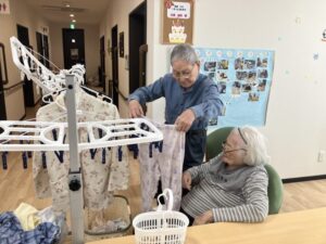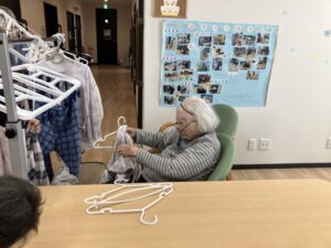 フロアーにて、入居者の皆様と一緒に洗濯物仕事を行いました😊