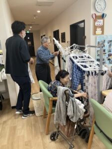 洗い上がった衣類を「ここに干したらいい??」と会話を楽しみながら、丁寧に一枚一枚干してくださいました👕✨
