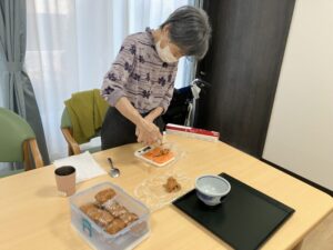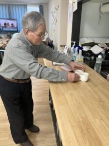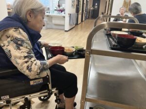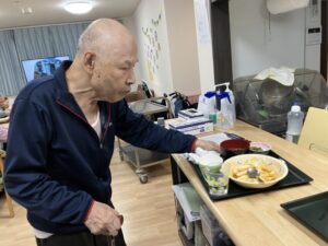車椅子をご使用の方も、ご自身でお盆を運ばれたり、テーブルまで届けてくださったりと積極的に参加されています。