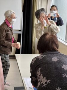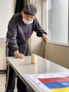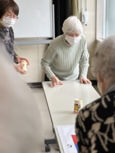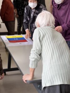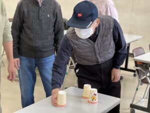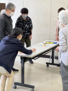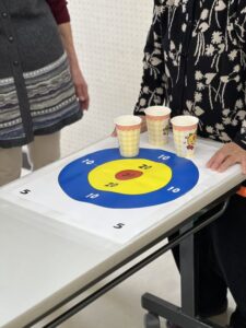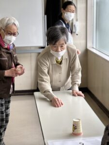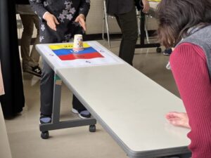 テーブルの上の的をめがけて、コップをそっと滑らせます。「もう少し右!」「惜しい!」と声を掛け合いながら、皆様真剣な表情で挑戦されていました😊