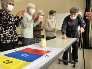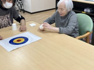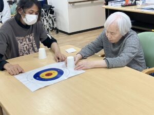 テーブルの上に的を用意し、コップを滑らせて狙った場所に止めるというシンプルなルールですが、実際にやってみると思った以上に力加減が難しく、「あー惜しい!」「もう少しだったね!」と皆様で声を掛け合いながら楽しまれていました✨