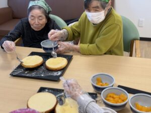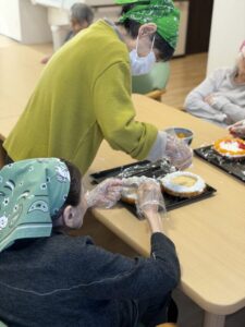 うまく飾り付けができた瞬間には、女性入居者様と女性スタッフが思わずハイタッチ✋✨