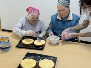 まずはスポンジケーキを袋から取り出し、皆様で協力しながらホイップクリームを丁寧に塗っていきます。