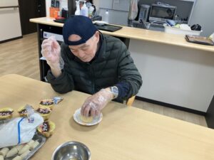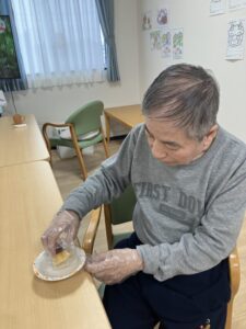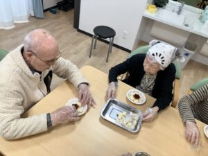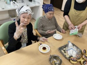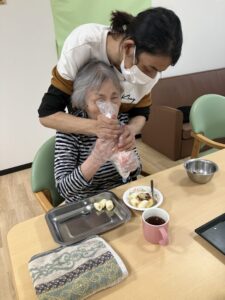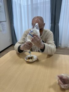 食事レクの一環として、フロアにて皆様と一緒におやつ作りを行いました🍩✨