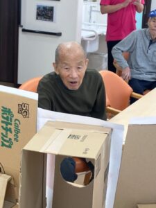 段ボールで作った鬼の的に豆をぶつけて倒すゲームです