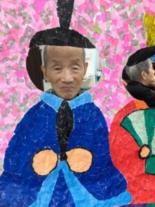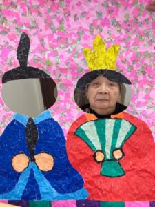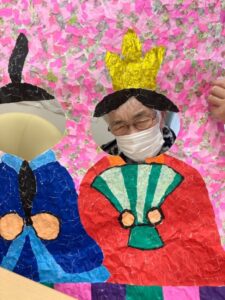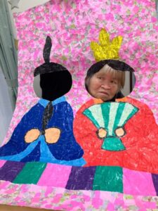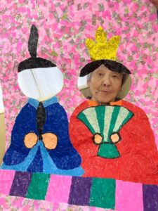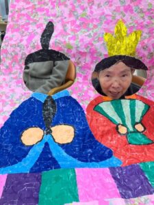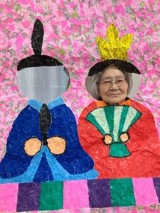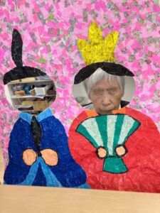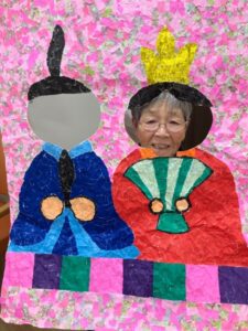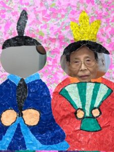 ご利用者様が作って下さったちぎり絵のお内裏様に顔を出して頂き