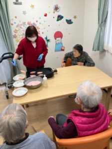 職員が焼いた皮にご婦人たちがあんこを包んで桜餅の形にして皆様にご提供しました