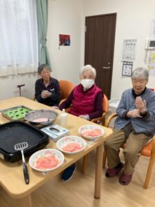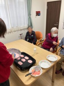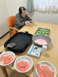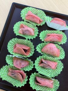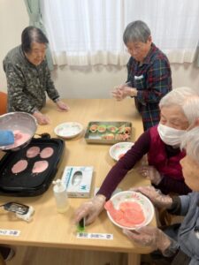 白玉粉と薄力粉、砂糖を混ぜた生地に薄くピンクの色付けした皮は甘味があってもっちりしてご利用者様にもとても好評でした。