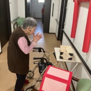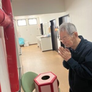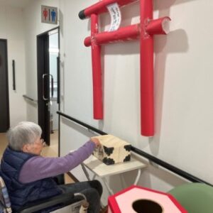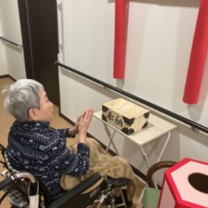 職員手作りの神社に、利用者様お一人お一人お賽銭をして手を合わせゆっくりお祈りしました。
