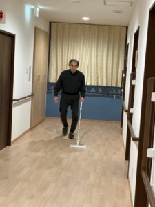 ワイパーを手に、廊下をスーッ。