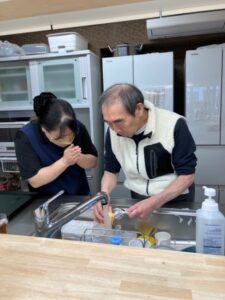 職員と並んで食器洗い