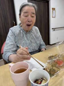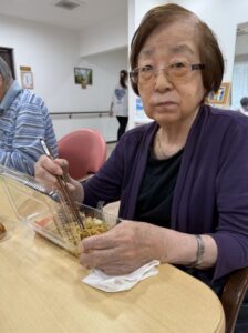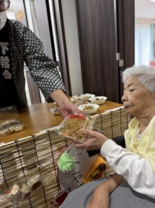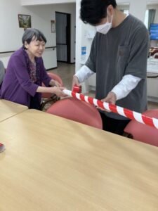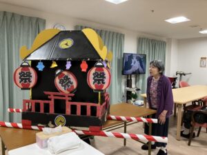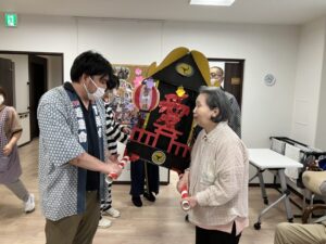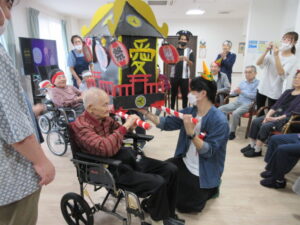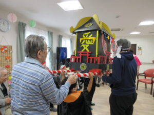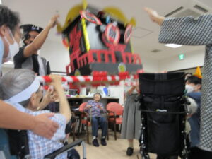 「わっしょい、わっしょい」お祭り魂に火が付いた男性入居者様がひときわ大きな声で発声して下さり大盛り上がり♪