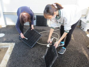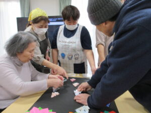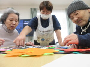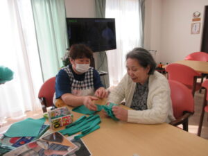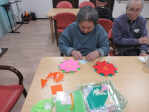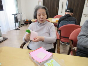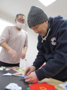 「赤と緑の折り紙を出し下さい」とスタッフ
