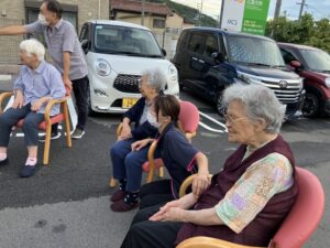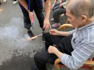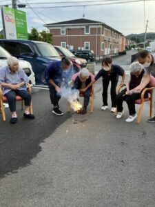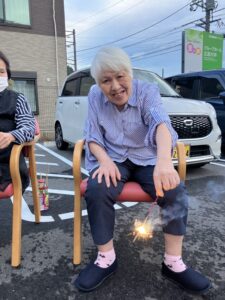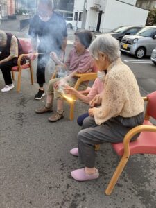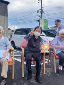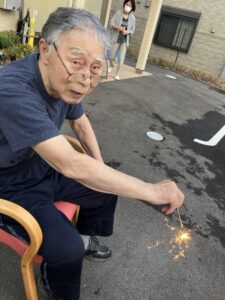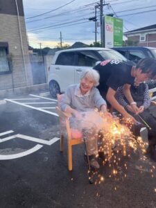 ※花火を上に向けて持たれてますが、ホーム長はじめスタッフが万全の態勢で対応しております。